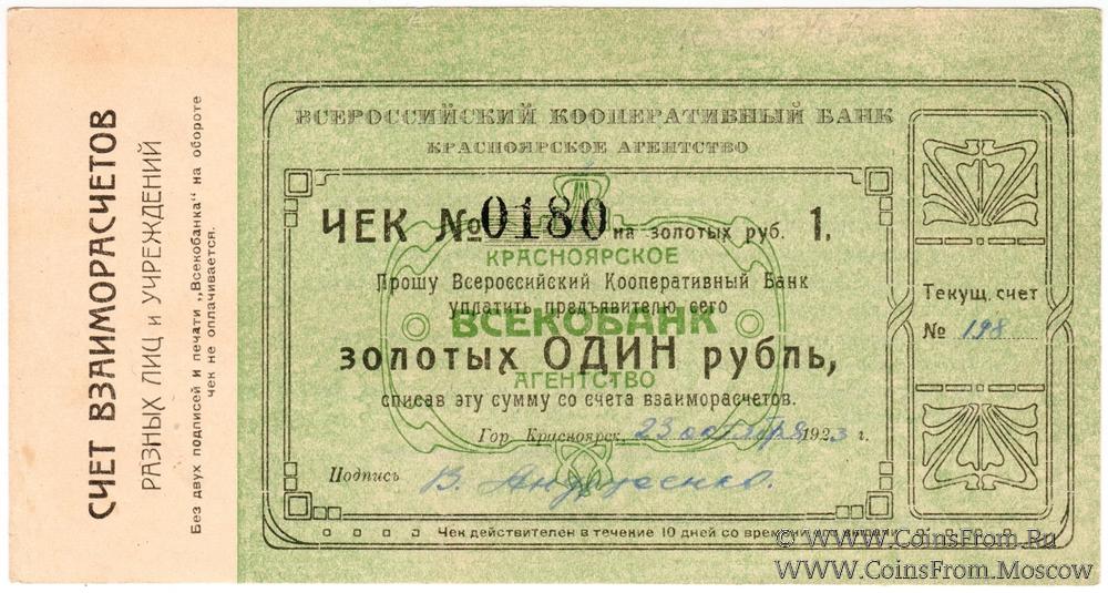 Печать круглая: "КРАСНОЯРСКОЕ АГЕНТСТВО." (по центру в две строки) / "* Всероссийский Кооперативный Банк. *" (по кругу)