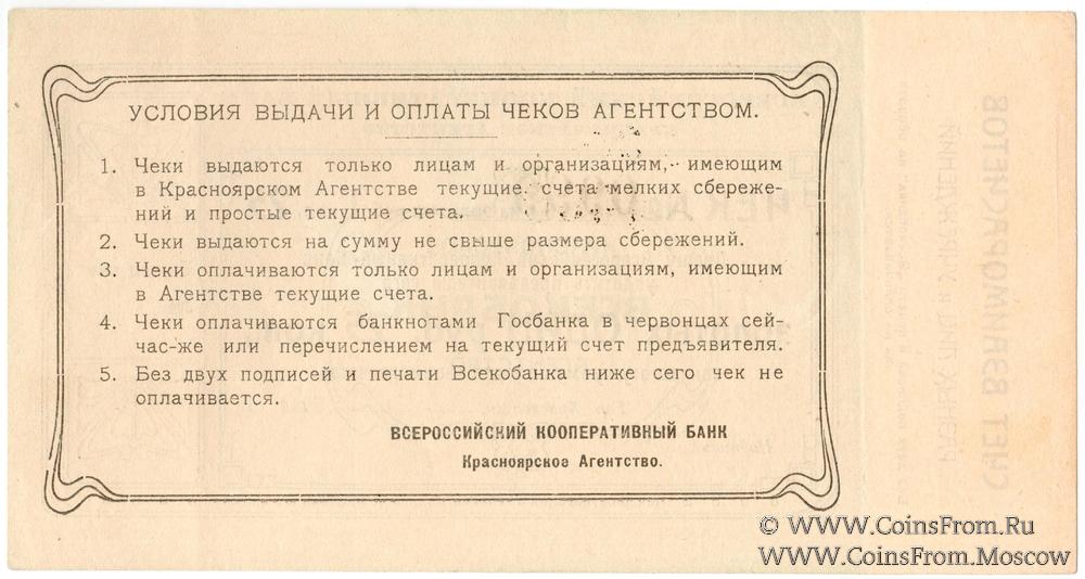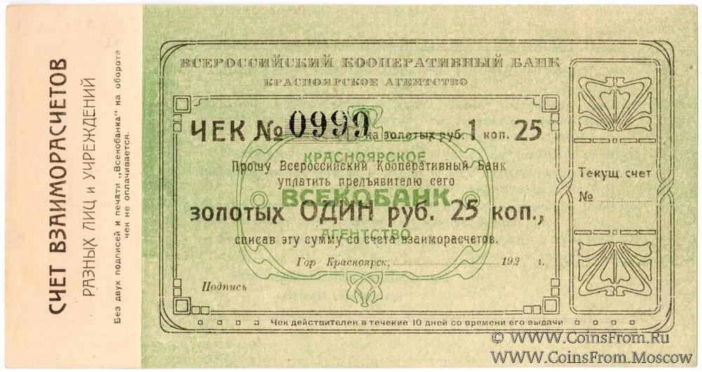 Чек 1923 г. в золотых рублях. Бланк с номером. Красноярское Агентство. Всероссийский Кооперативный Банк.