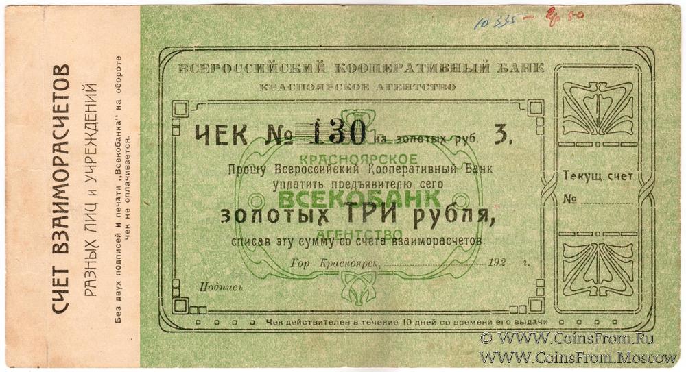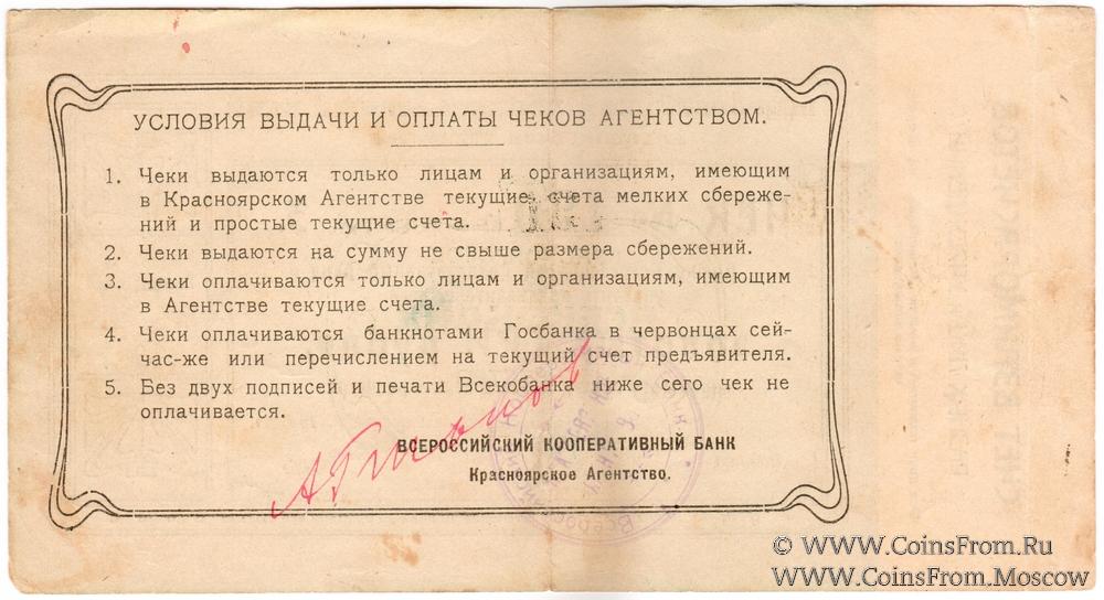 Печать круглая: "КРАСНОЯРСКОЕ АГЕНТСТВО." (по центру в две строки) / "* Всероссийский Кооперативный Банк. *" (по кругу)