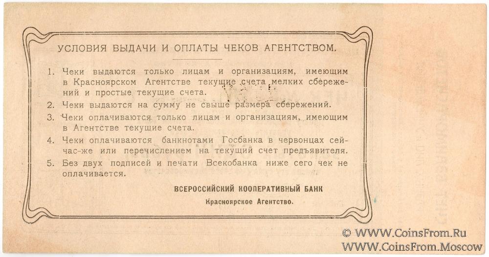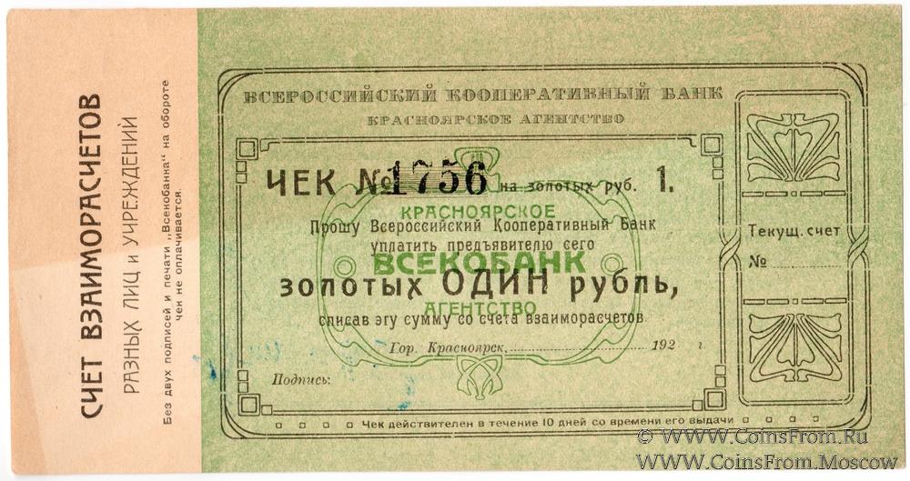 Чек 1923 г. в золотых рублях. Бланк с номером. Красноярское Агентство. Всероссийский Кооперативный Банк.