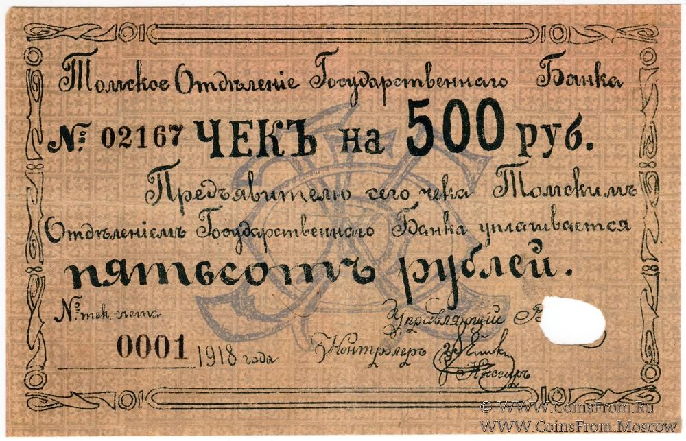 Чек 1918 г. Гашение. Без печати. На реверсе отпечаток номера следующего чека (02168). Томское Отделение Государственного Банка.