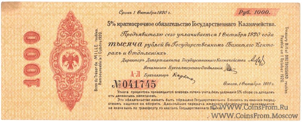 Выпуск 1 октября 1919 г. Серия А-Л. Серия - красно-коричневая (цвета картуша). 5% Краткосрочные Обязательства Государственного Казначейства (г. Омск).