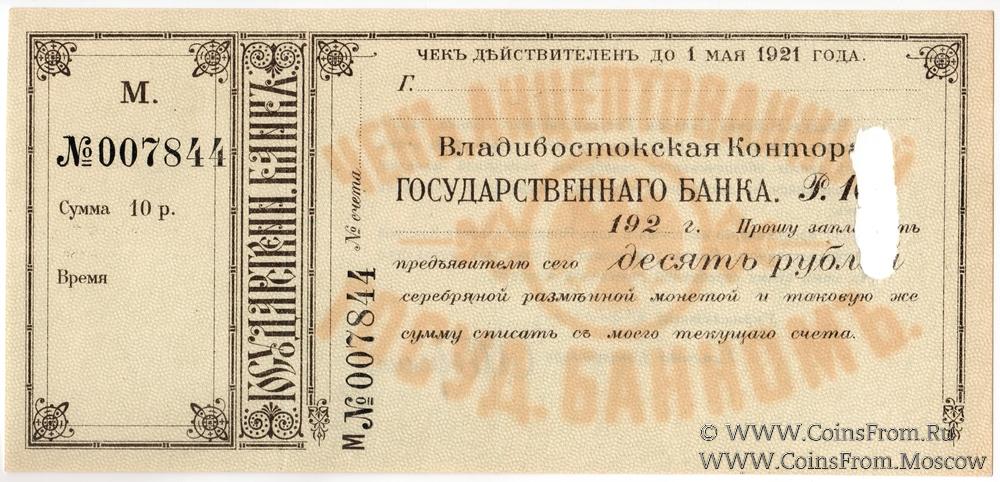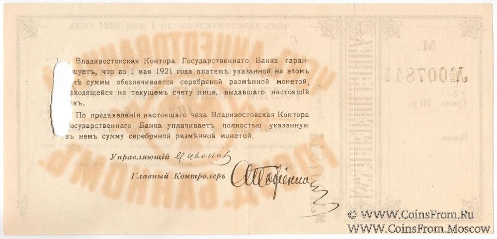 Чек с корешком. Действителен до 1 мая 1921 г. (в рублях серебряной монетой). Гашение. Владивостокское Отделение Государственного Банка.