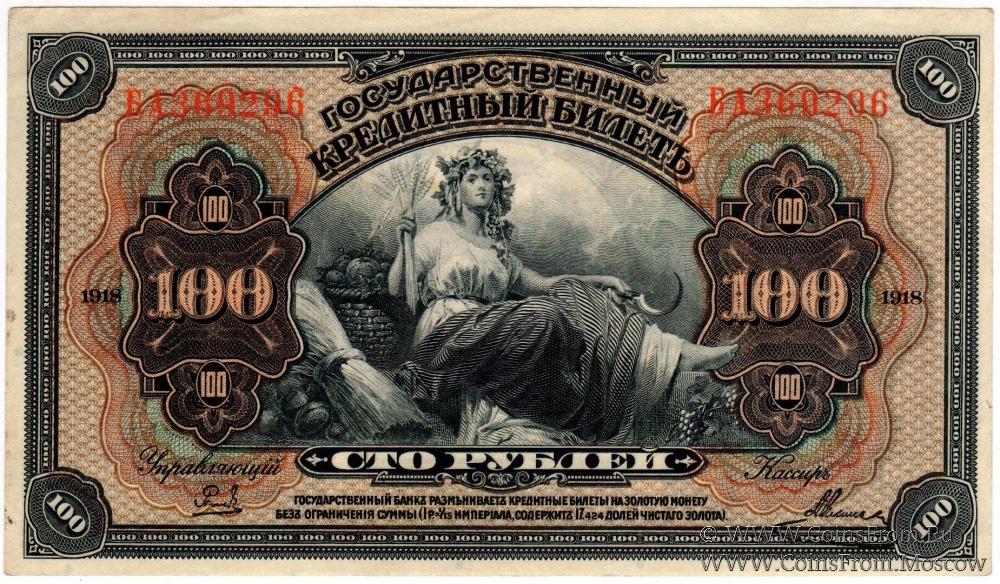 Государственный Кредитный билет 1918 (с подписями на аверсе Иванов-Ковнацкий - 1920). Подписи черные на аверсе и реверсе. Кассир - Васильев А. Государственный Банк. Подписи на аверсе - сдвиг вправо.