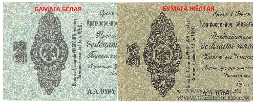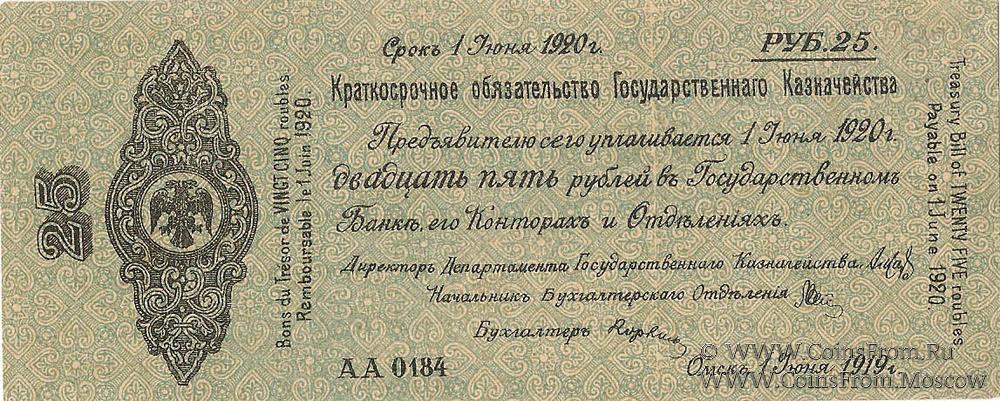 Выпуск 1 июня 1919 г. Серия АА. Слово "Государственнаго" без сокращений. Бумага жёлтая. 5% Краткосрочные Обязательства Государственного Казначейства.