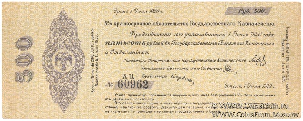 Выпуск 1 июня 1919 г. Две литеры в серии, серия с тире: А-Ц. 5% Краткосрочные Обязательства Государственного Казначейства.