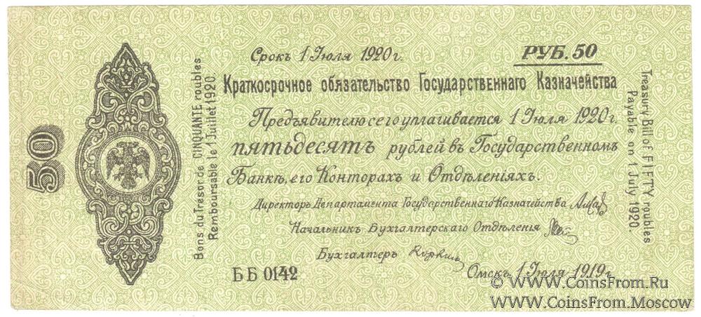 Выпуск 1 июля 1919 г. Серия ББ. Слово "Государственнаго" без сокращений. Бумага белая. 5% Краткосрочные Обязательства Государственного Казначейства.