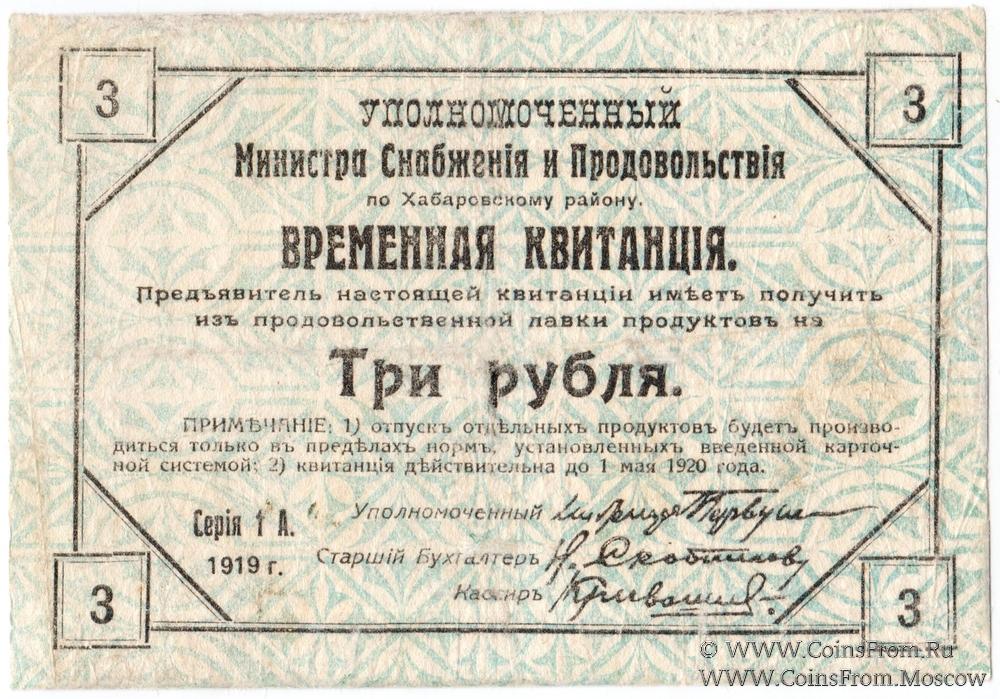 Временная квитанция образца 1919 г. Серия 1А. Уполномоченный Министра Снабжения и Продовольствия по Хабаровскому Краю.