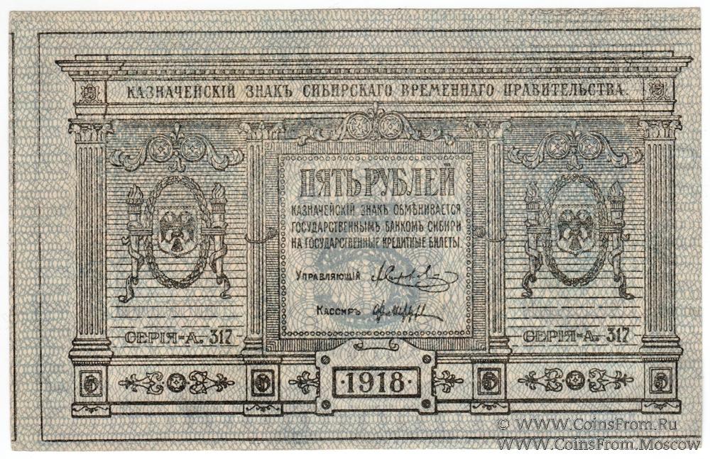 БРАК обрезки (сдвиг фона). Аверс: без точки в номере. Реверс: кольца плотно (вариант 2). Казначейский знак Сибирского Временного Правительства 1918 г. Государственный Банк Сибири.