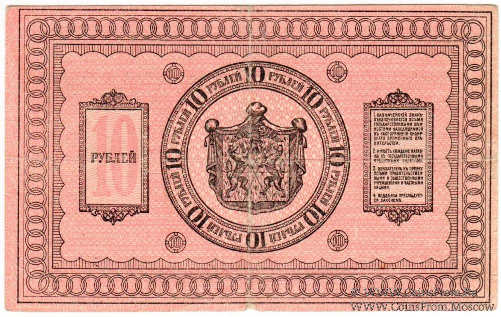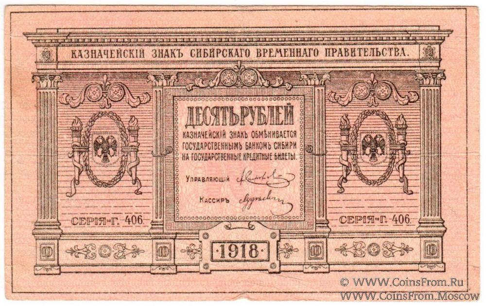 Бумага толстая. Бледно-розовый фон аверса. Казначейский знак Сибирского Временного Правительства 1918 г. Государственный Банк Сибири.
