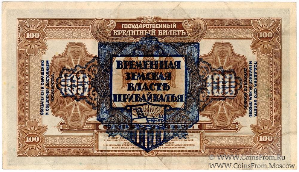 Билеты американского изготовления с надпечаткой произведенной Иркутской ЭЗГБ: на билетах в 100 рублей наложен гриф "Временная Земская Власть Прибайкалья" синей краской.