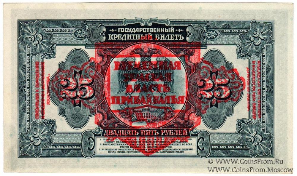 Билеты американского изготовления с надпечаткой произведенной Иркутской ЭЗГБ: на билетах в 25 рублей наложен гриф «Временная Земская Власть Прибайкалья» красной краской.