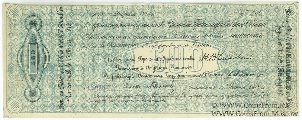 5% краткосрочное обязательство Временного Правительства Северной Области. В тексте без "и" после "финансовъ". Слово "Предъявителю..." без отступа. Номер фиолетовый.
