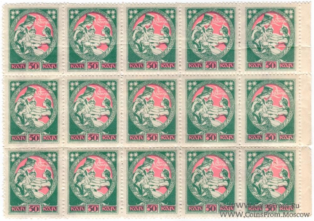 Временный разменный знак. БРАК: только реверс. Вторичное использование: Марка 50 коп (Вариант рис. 2); латвийская почта. Перфорация.