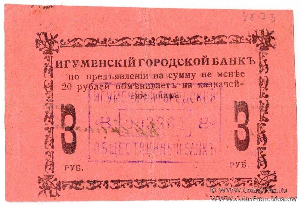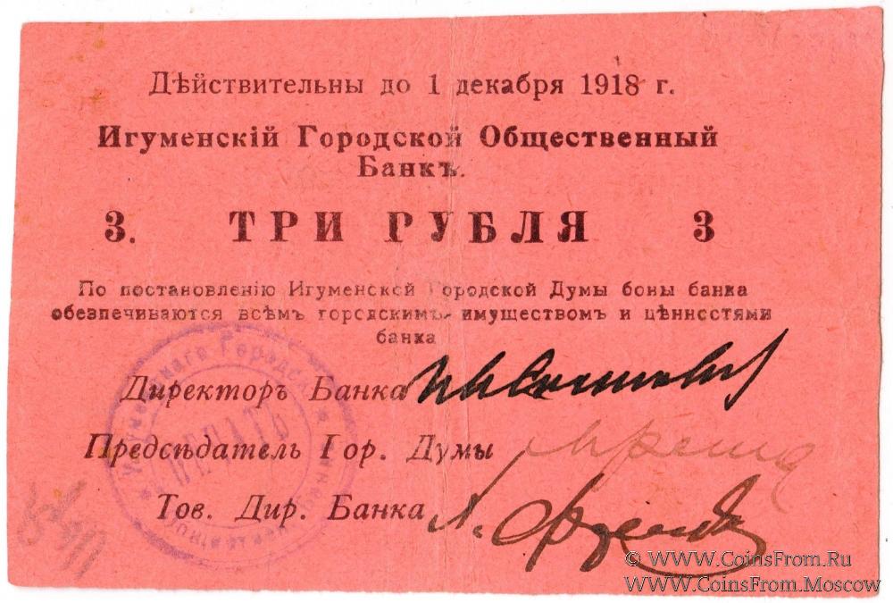 Бон. Действителен до 1 декабря 1918 г. Вариант 1 цифры "3". Розовый. Игуменский Городской Общественный Банк.