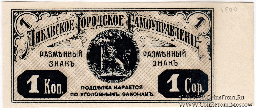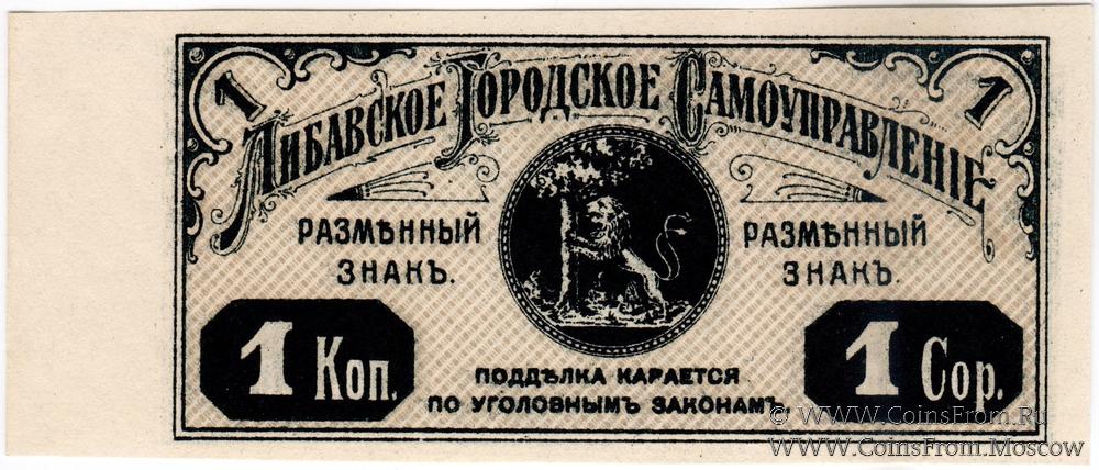 Разменный знак без даты (1915 г.). БРАК обрезки: белое поле справа. Фон серо-коричневый. Углы не очерчены тонкими линиями. Либавское Городское Самоуправление.