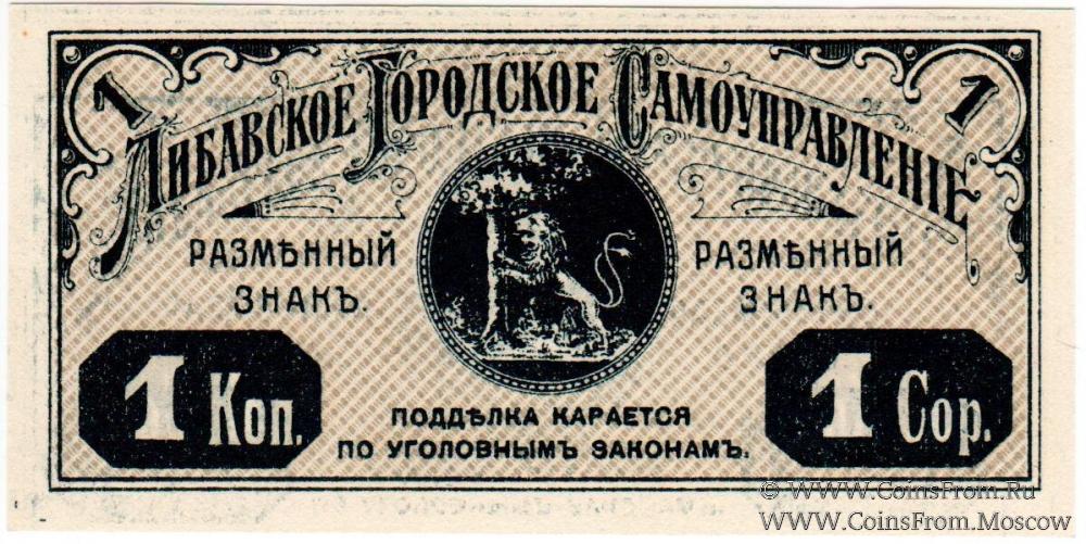 Разменный знак без даты (1915 г.). Фон серо-коричневый. Углы не очерчены тонкими линиями. Либавское Городское Самоуправление.