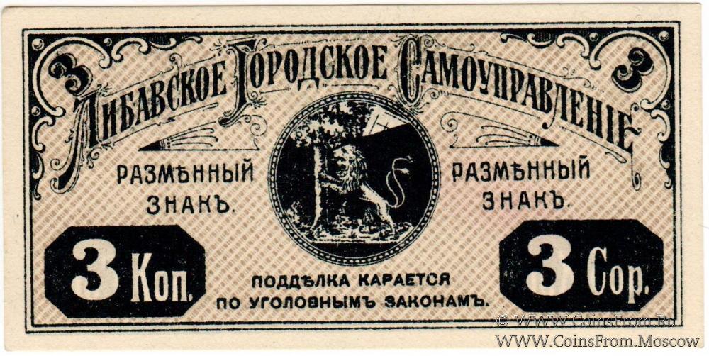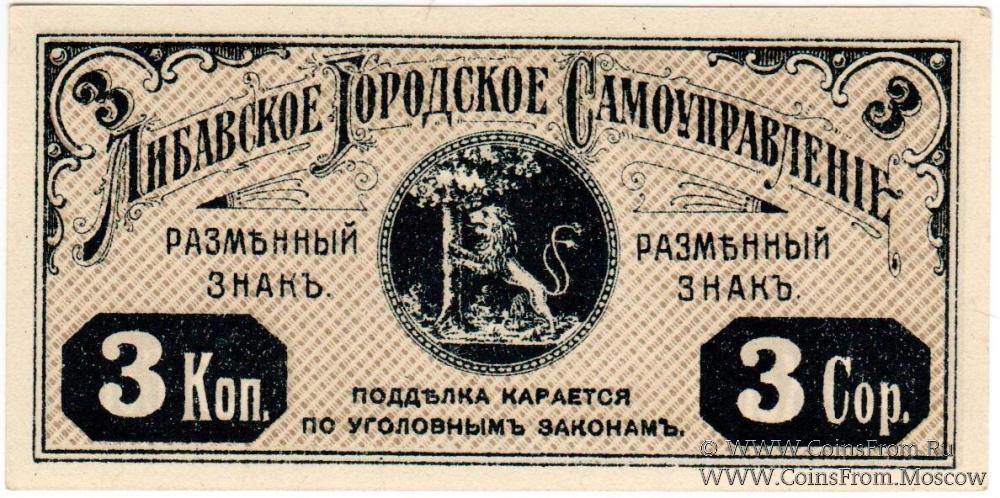 Разменный знак без даты (1915 г.). Фон серо-коричневый. Углы не очерчены тонкими линиями. Либавское Городское Самоуправление.