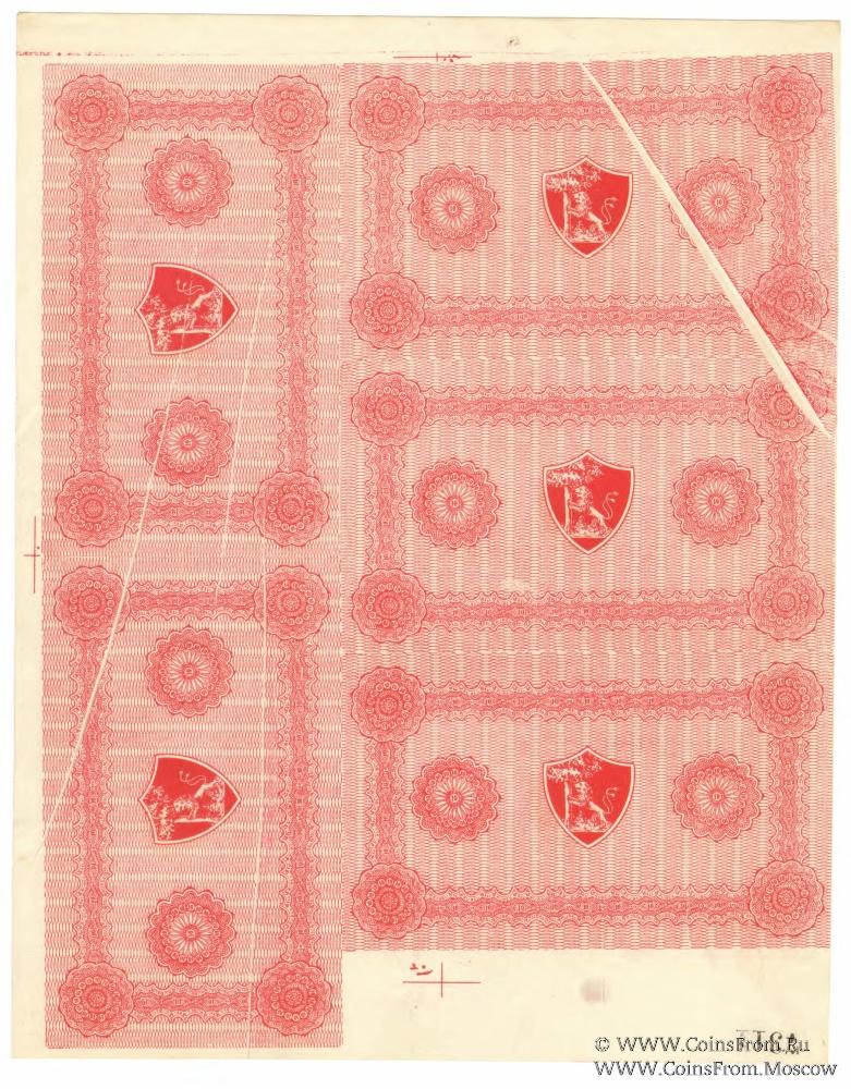 БРАК печати (только фон), замятия, заготовка (неразрезаный лист из 5 банкнот). Долговая расписка 1915 г. Фрагменты водяного знака. Либавское Городское Самоуправление.