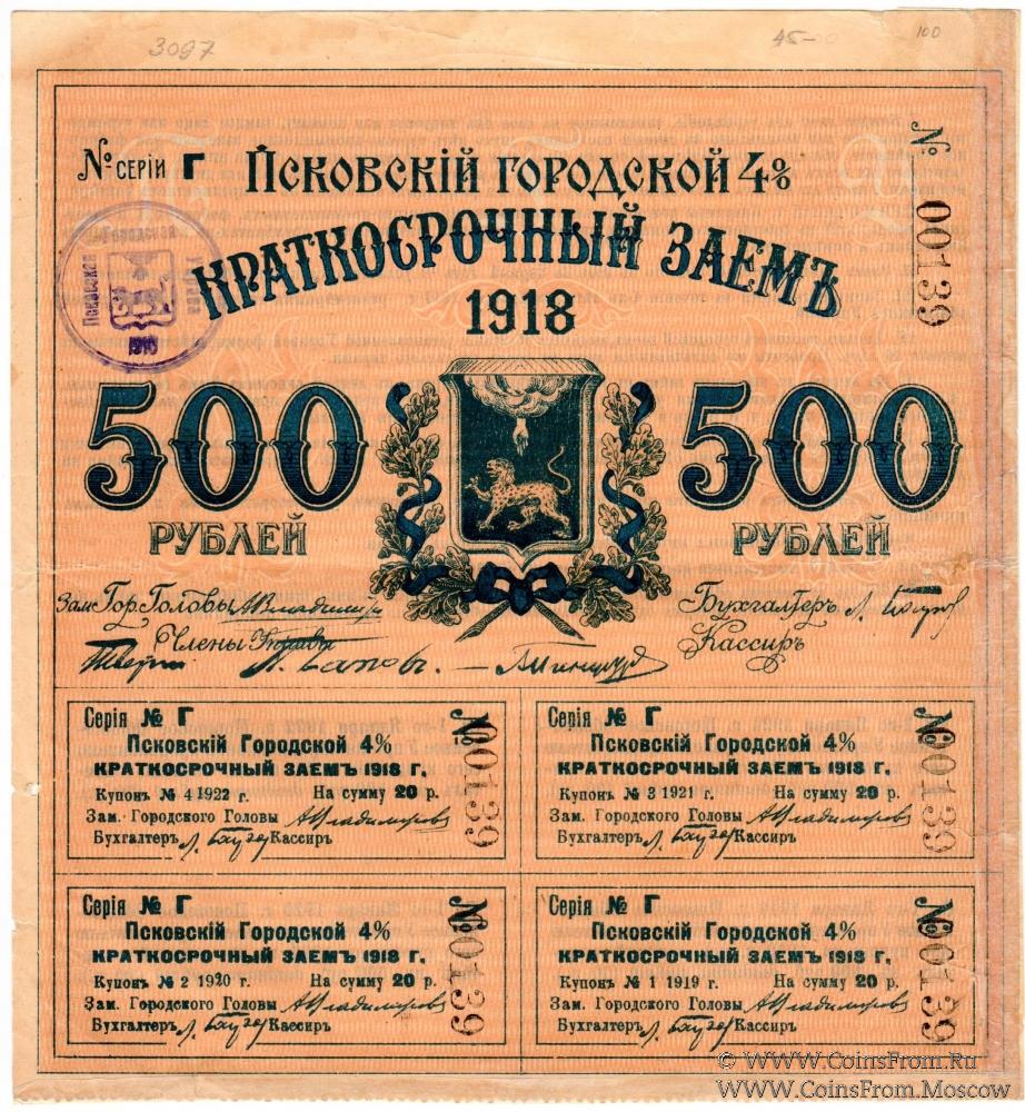Серия Г. С печатью на аверсе. Псковский городской 4% краткосрочный заем.