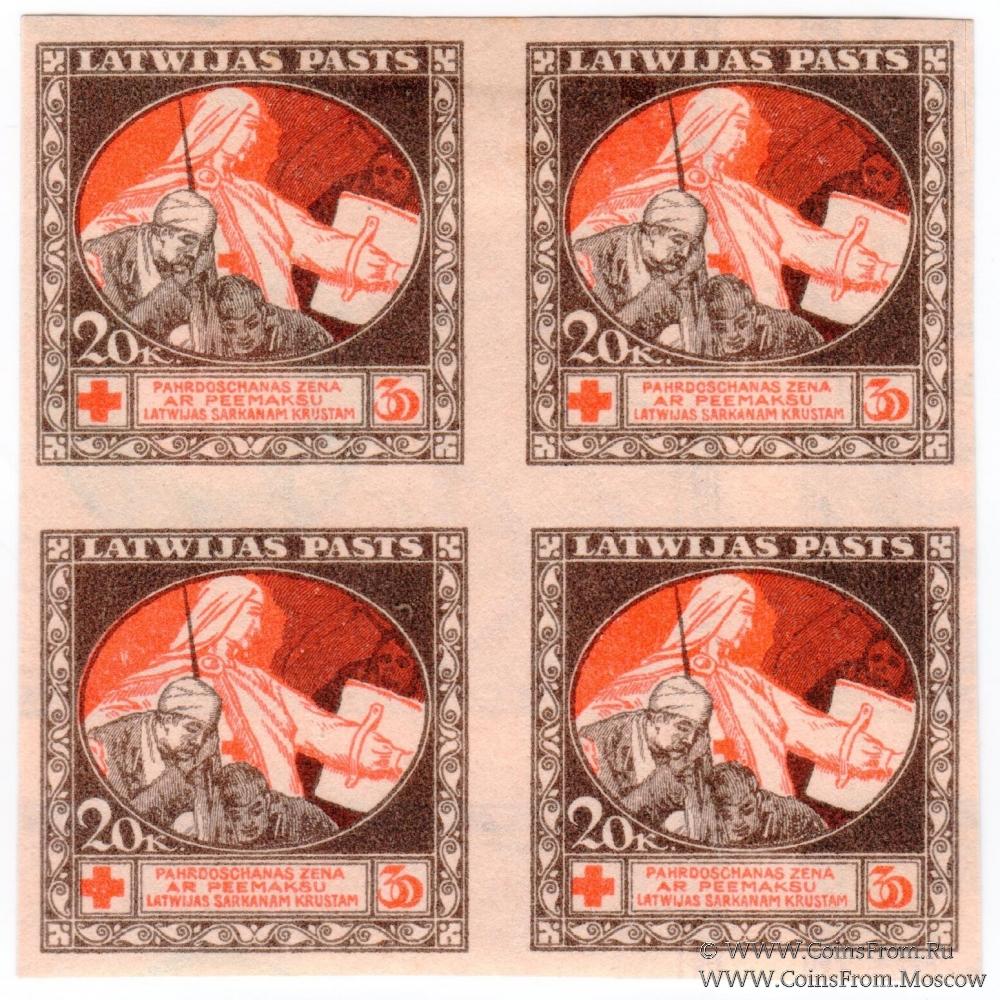 БРАК: часть аверса (10 рублей 1919 г. Рижский Совет рабочих депутатов). Вторичное использование: Марка 20 коп. без зубцов (Латвийская почта).