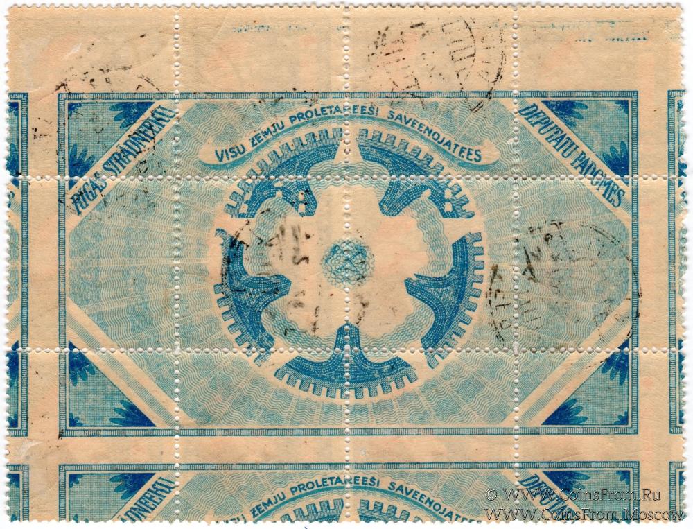 БРАК: часть фонового рисунка аверса (5 рублей 1919 г. Рижский Совет рабочих депутатов). Вторичное использование: Марка 50 коп. с гашением 1922 г. (Латвийская почта).