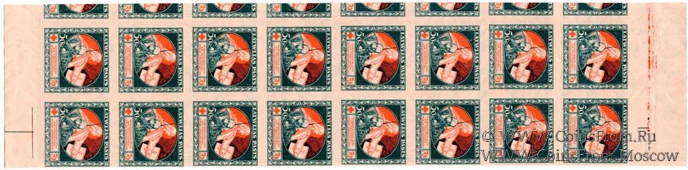 БРАК: сцепка из аверсов (10 рублей 1919 г. Рижский Совет рабочих депутатов). Вторичное использование: Марка 50 коп. без зубцов (Латвийская почта).