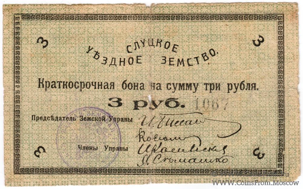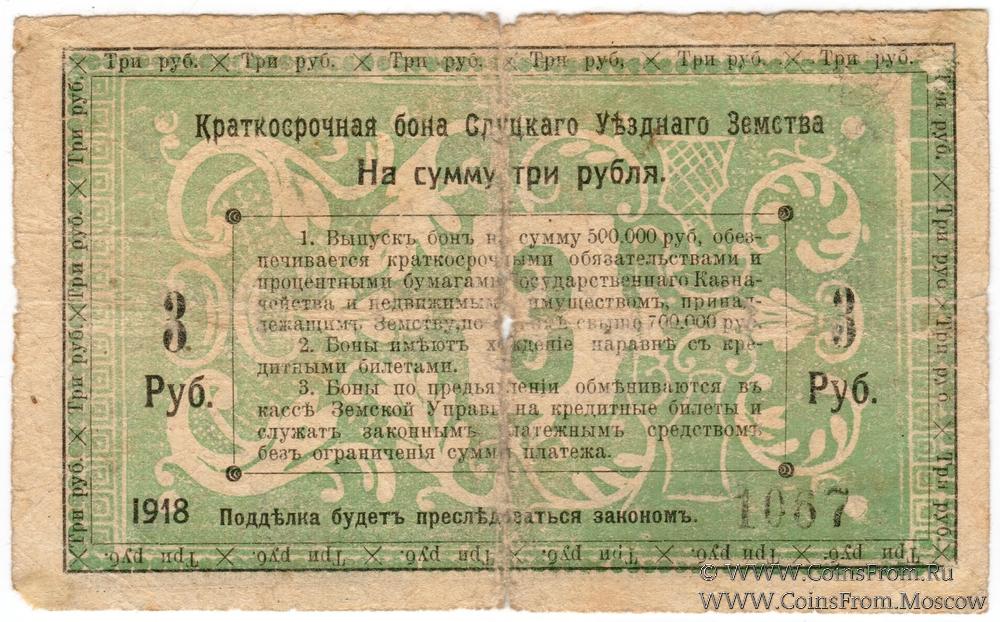 Краткосрочная бона 1918 г. Номер 4-значный. Слуцкое Уездное Земство.
