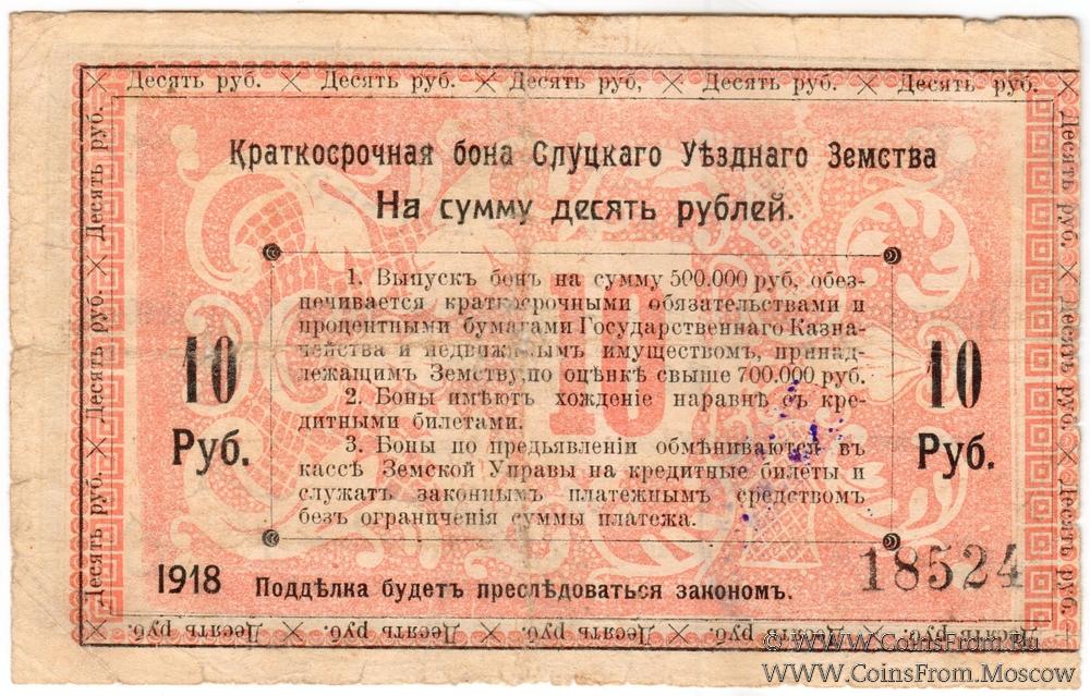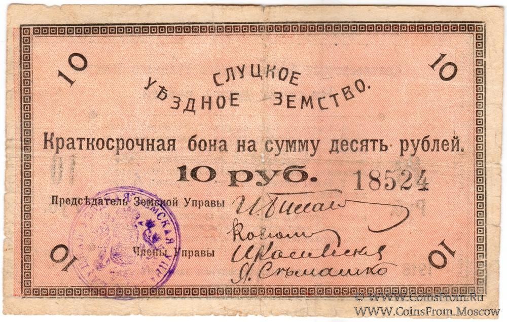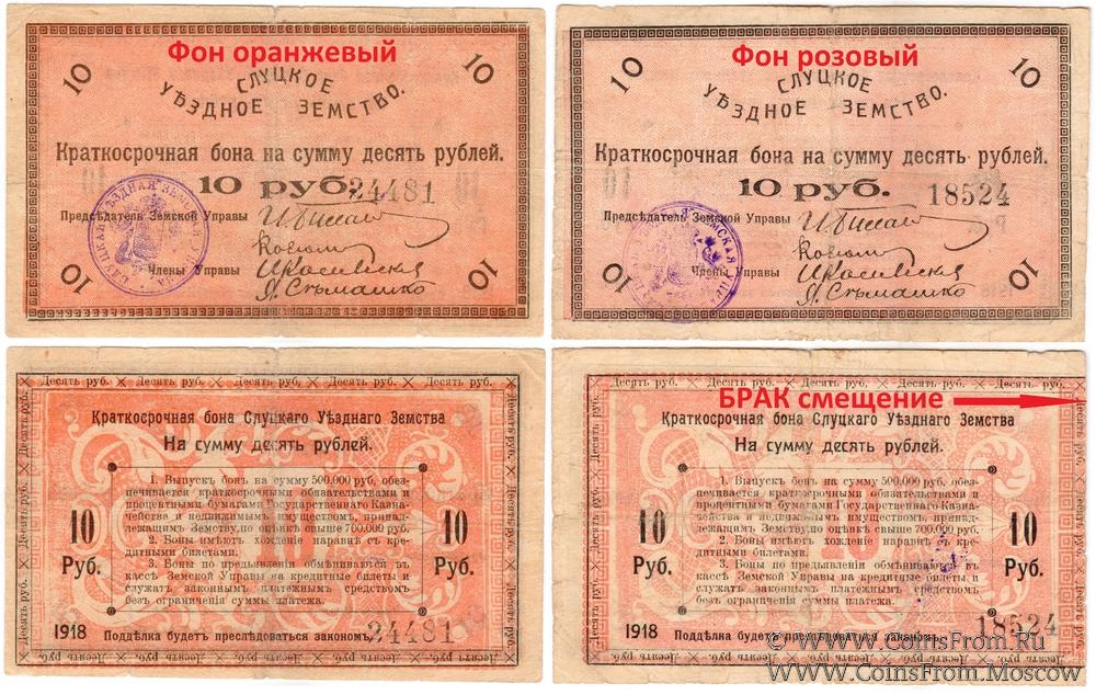 Краткосрочная бона 1918 г. БРАК печати: смещение текста и фона на реверсе. Фон розовый. Слуцкое Уездное Земство.