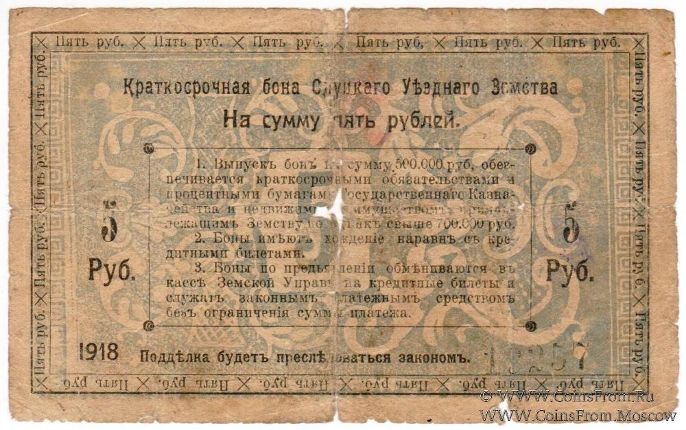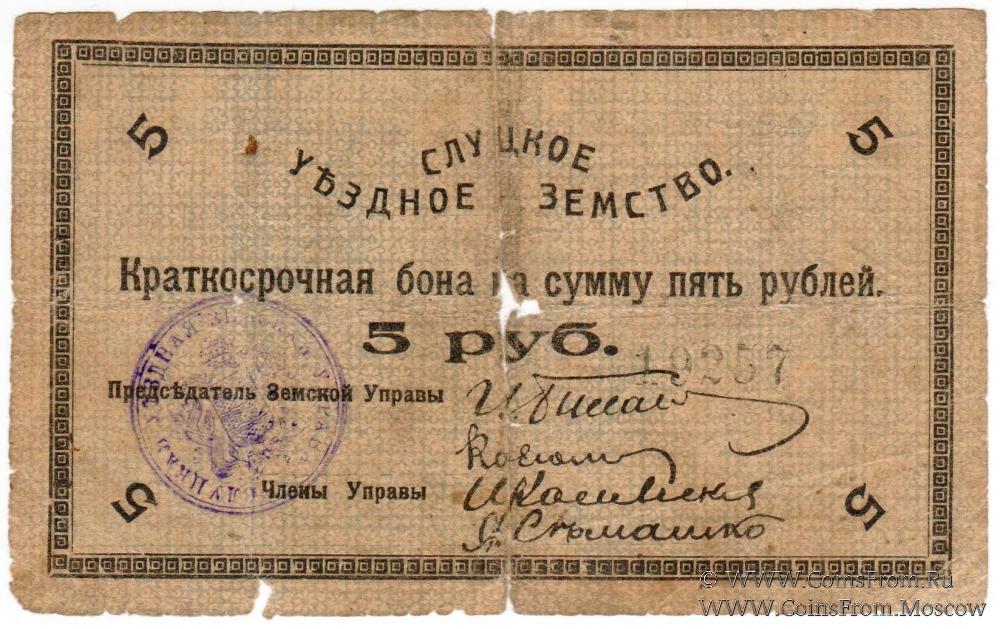 Краткосрочная бона 1918 г. Номер 5-значный. Слуцкое Уездное Земство.