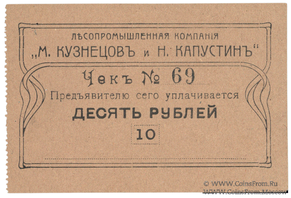 Чек без даты. Бланк. Лесопромышленная компания М.Кузнецова и Н.Капустина.
