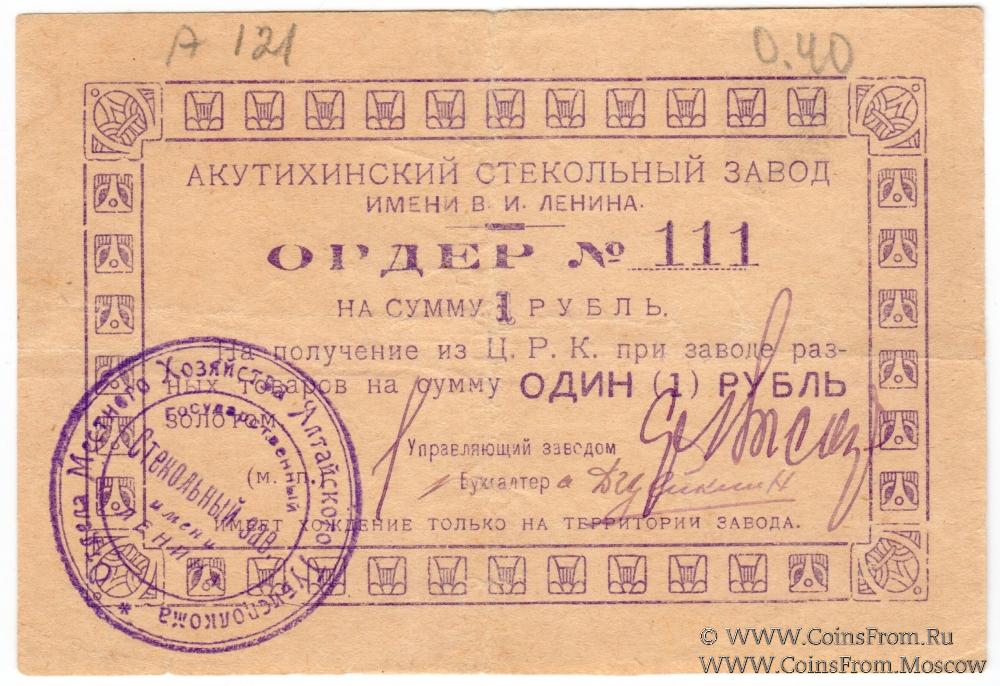 Ордер без даты (1919 г.). Печать "Государственный стекольный завод им. Ленина". Акутихинский стекольный завод им. Ленина.