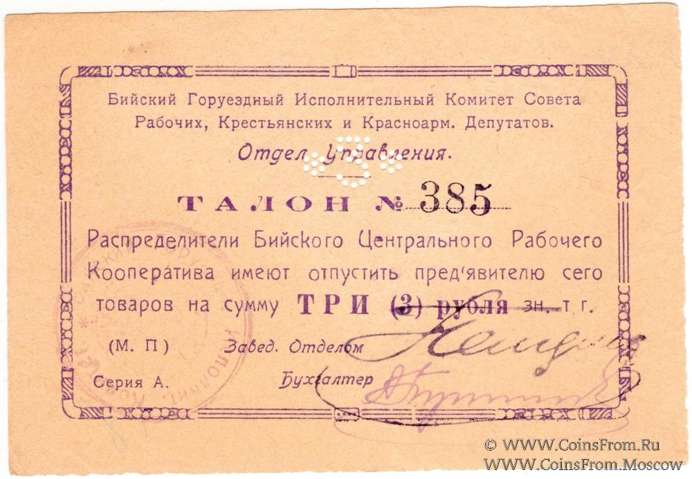 Талон без даты. Перфорация "*3*". Отдел Управления. Бийский Горуездный Исполнительный Комитет Совета Рабочих, Крестьянских и Крсноармейских Депутатов.
