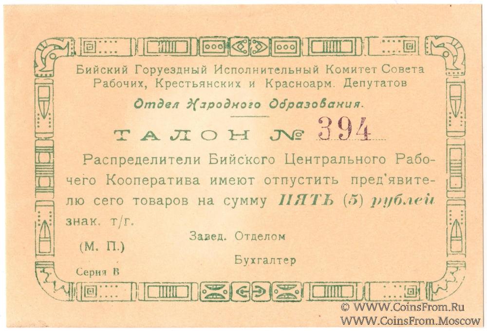 Талон без даты. Бланк. Отдел Народного Образования. Бийский Горуездный Исполнительный Комитет Совета Рабочих, Крестьянских и Крсноармейских Депутатов.