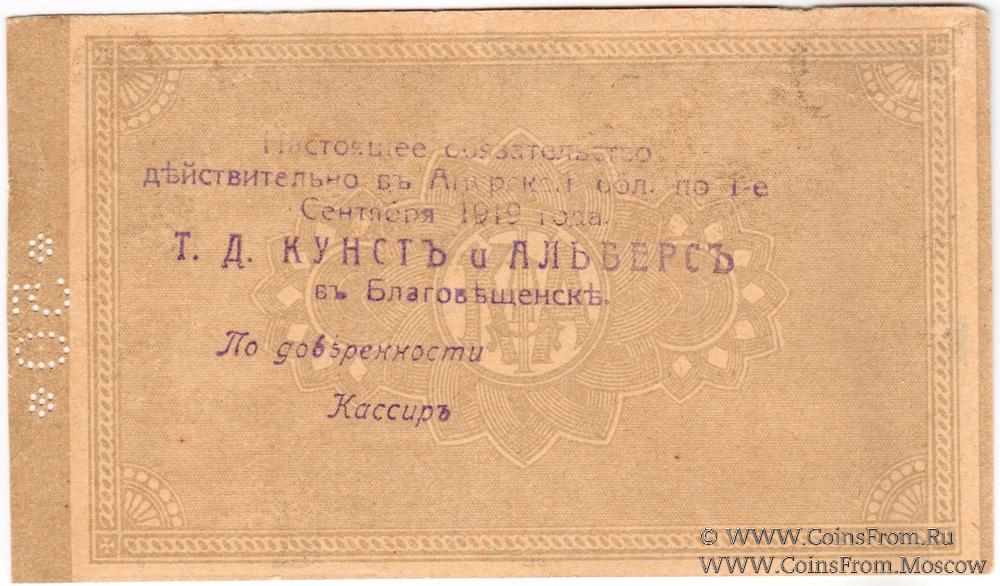 Обязательство 1918 г. Перфорация "*50*". Надпечатка на реверсе обязательств Владивостока. Торговый Дом "Кунстъ и Альберсъ" в Благовещенске.
