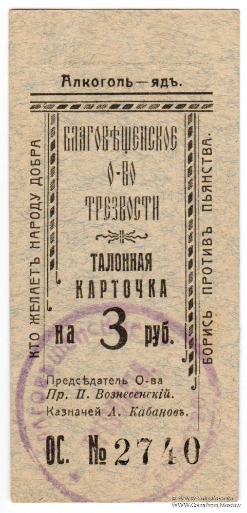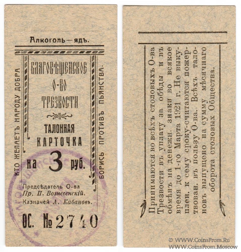 Талонная карточка без даты (действительна до 1.03.1921 г.). Серия ОС. Благовещенское Общество Трезвости.