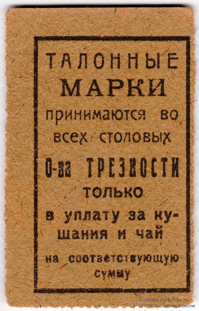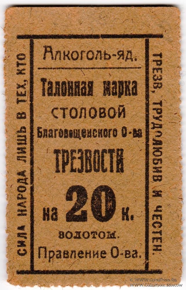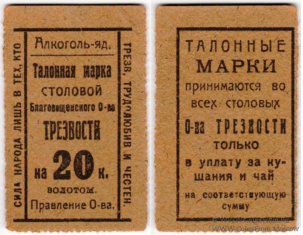 Талонная марка столовой в золотых рублях без даты (1923 г.). Благовещенское Общество Трезвости. Правление Общества.