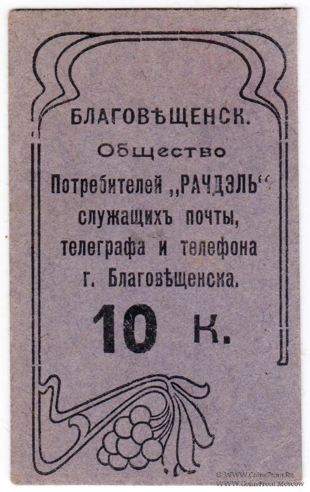 Фиолетовый. Печать на реверсе. Общество Потребителей "Рачдэль" служащих почты, телеграфа и телефона г. Благовещенска.