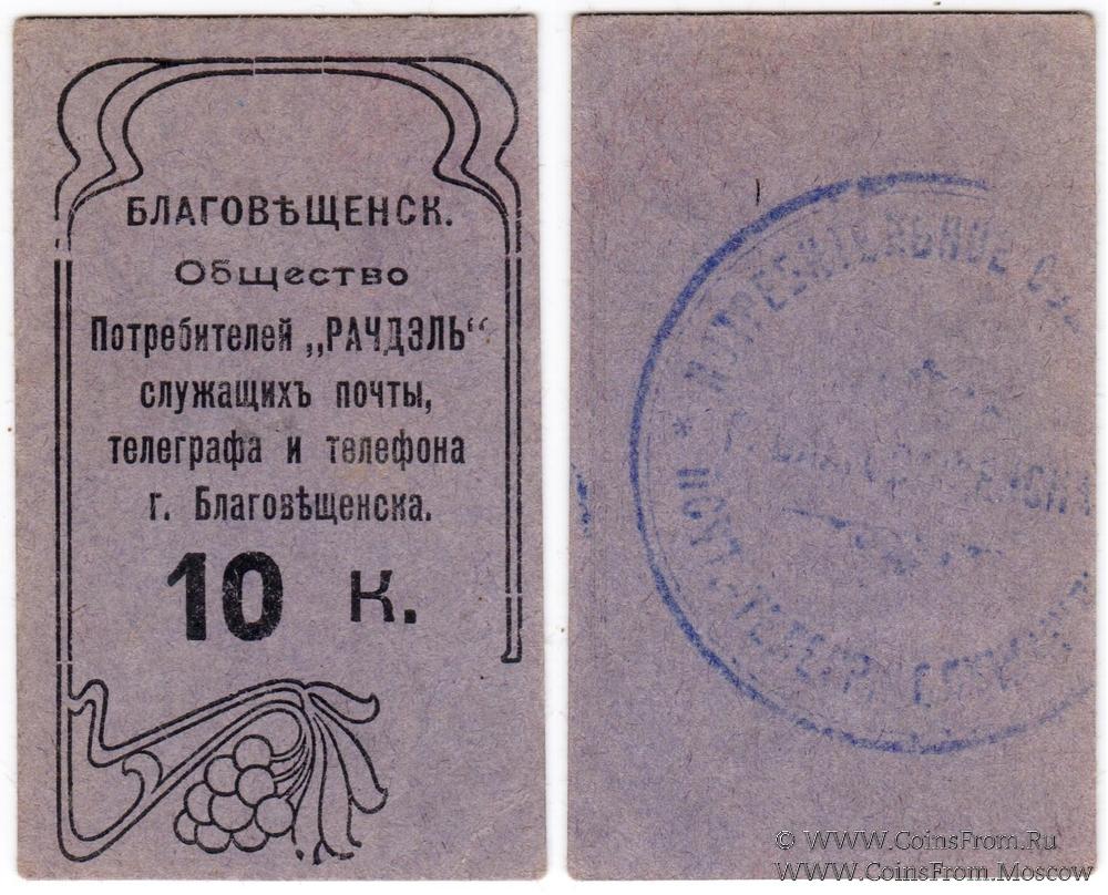 Печать на реверсе: "ПОТРЕБИТЕЛЬНОЕ ОБЩЕСТВО * ПОЧТ.-ТЕЛЕГР. СЛУЖАЩИХЪ (по кругу) Г.БЛАГОВЪЩЕНСКА (по центру)".