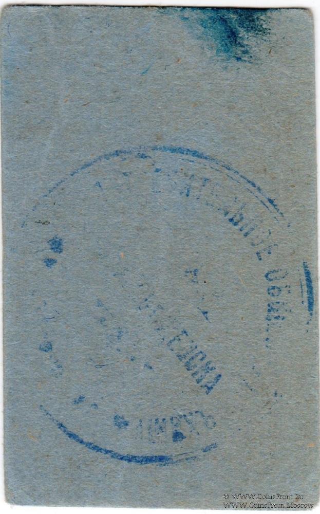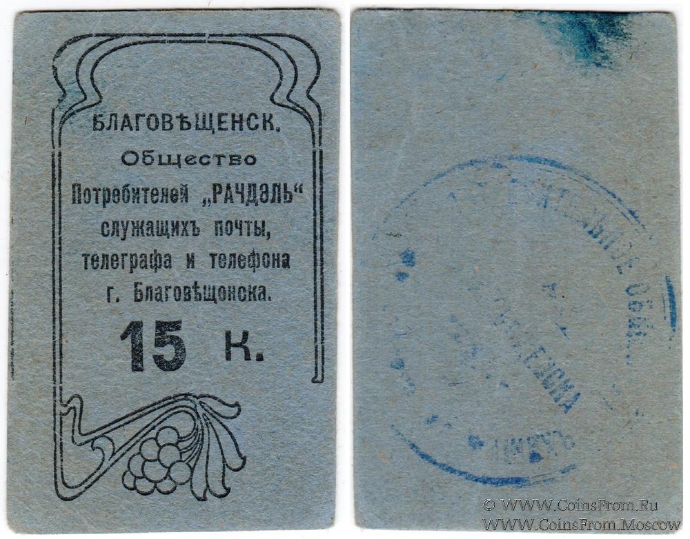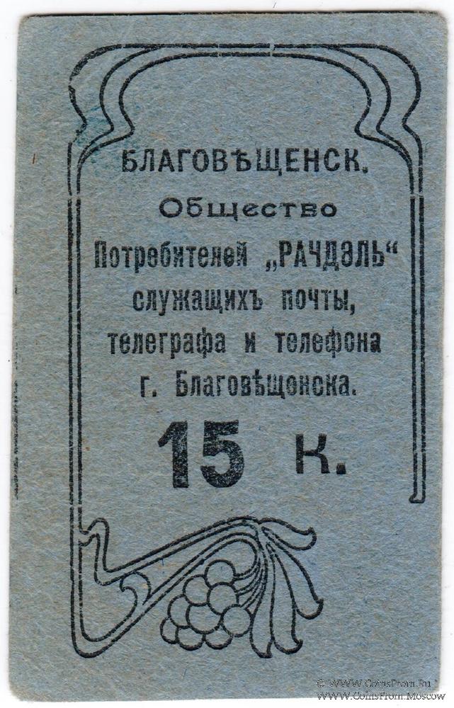 Синий. Печать на реверсе. Общество Потребителей "Рачдэль" служащих почты, телеграфа и телефона г. Благовещенска.