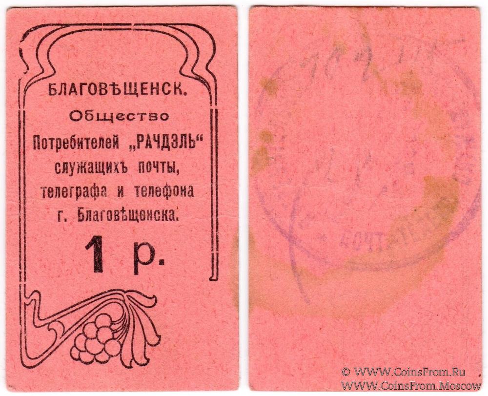 Печать на реверсе. Общество Потребителей "Рачдэль" служащих почты, телеграфа и телефона г. Благовещенска.