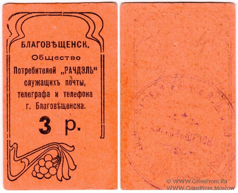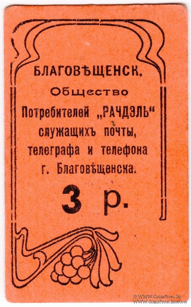 Печать на реверсе. Общество Потребителей "Рачдэль" служащих почты, телеграфа и телефона г. Благовещенска.