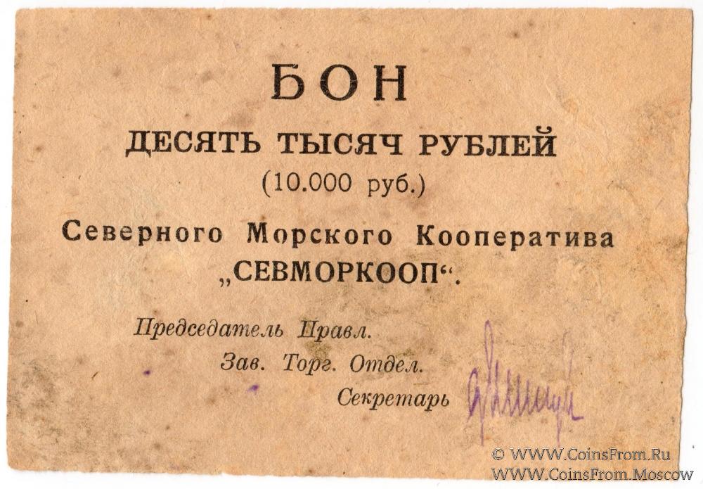Бон без даты (1923 г.). С подписью Секретаря на аверсе. Северный Морской Кооператив "СЕВМОРКООП".