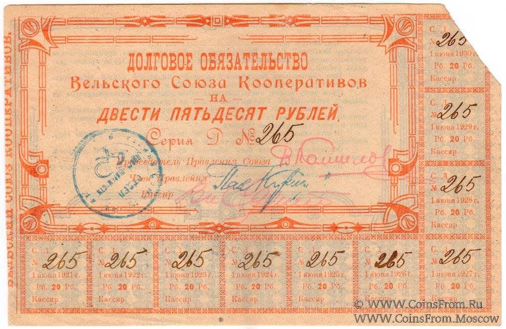 Печать круглая (синяя): "ОТДЕЛ / ПРОМЫШЛЕННОСТИ" (по центру в две строки, ниже изображение серпа и молота) / "Вельский Союз Кооперативов" (по кругу).