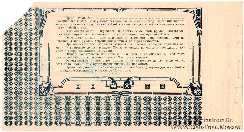 Долговое обязательство 1920 г. Серия В. С корешком. Вельский Союз Кооперативов.