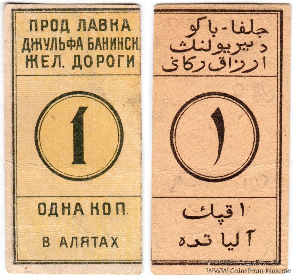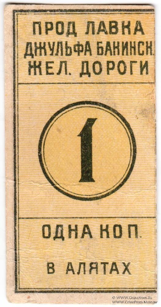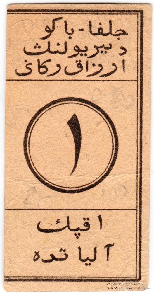 Без названия без даты (1918 г.). Фон аверса жёлтый ("1"). Продлавка Джульфа Бакинской железной дороги в Алятах.