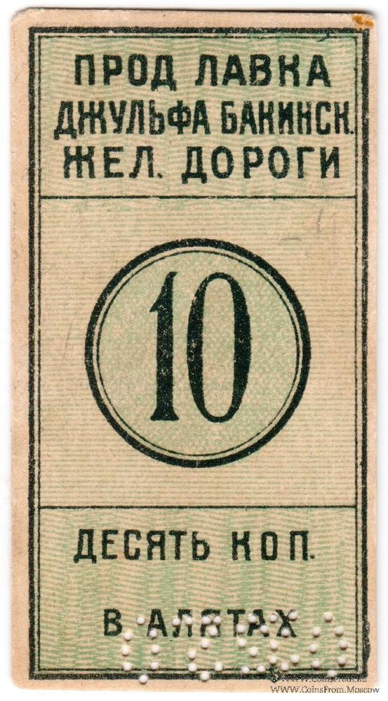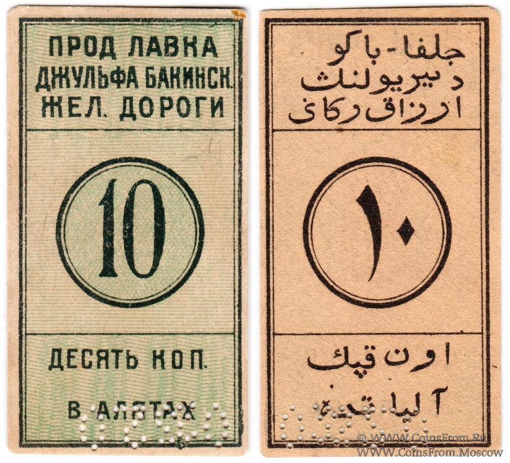 Без названия без даты (1918 г.). Фон аверса зелёный ("10"). Продлавка Джульфа Бакинской железной дороги в Алятах.