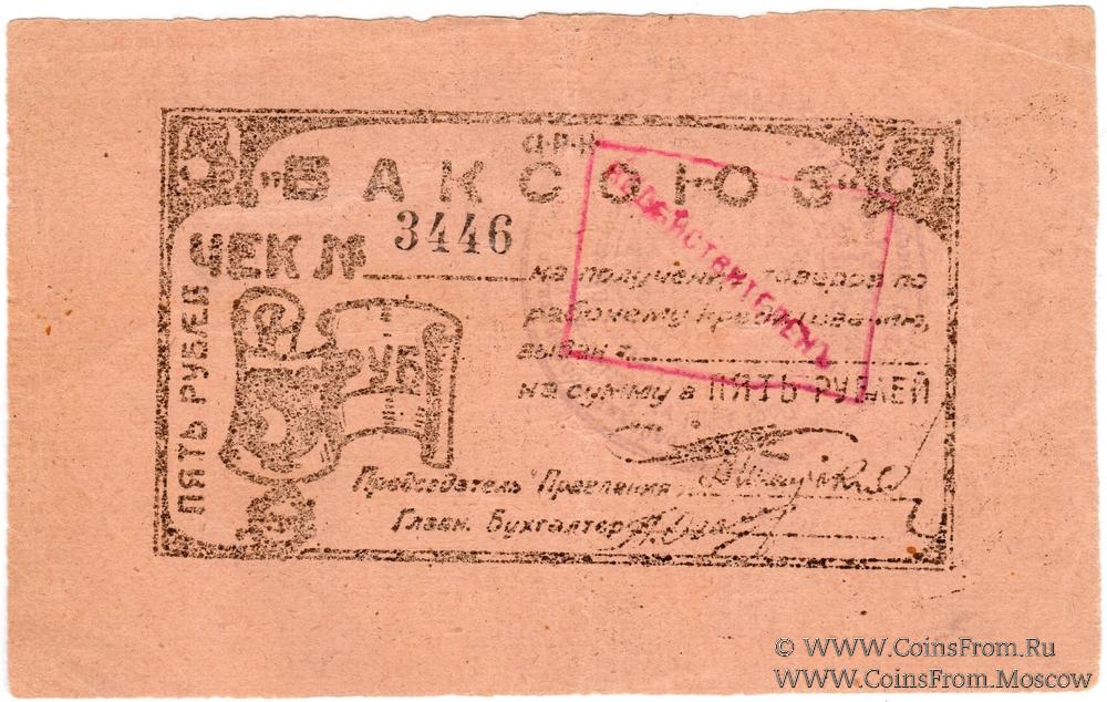 Чек без даты. С оттиском печати Союза на аверсе и реверсе. На аверсе штамп красного цвета "НЕДЕЙСТВИТЕЛЕНЪ". Центральный рабочий кооператив "Баксоюз".