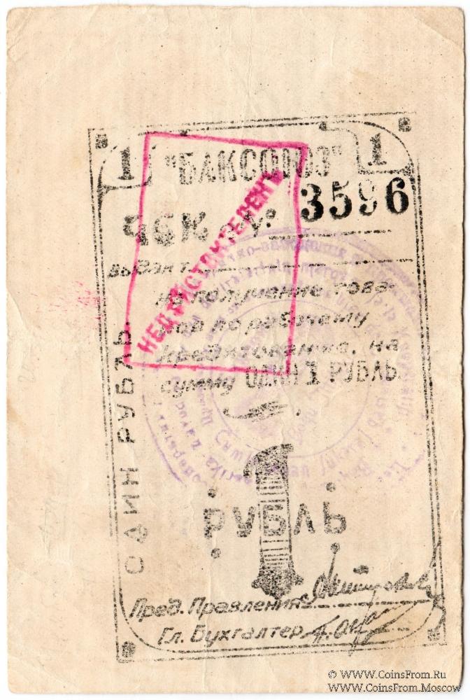 Чек без даты. С оттиском печати Союза на аверсе. На аверсе штамп красного цвета "НЕДЕЙСТВИТЕЛЕНЪ". Центральный рабочий кооператив "Баксоюз".