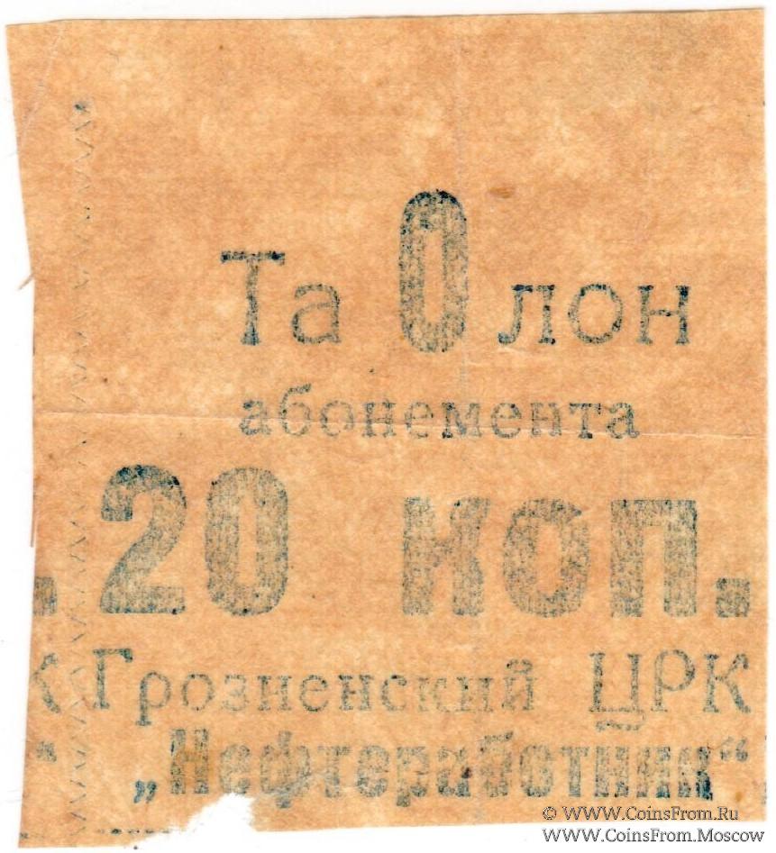 Талон абонемента без даты. Литера О. Голубой текст. Грозненский Центральный Рабочий Кооператив "НЕФТЕРАБОТНИК".